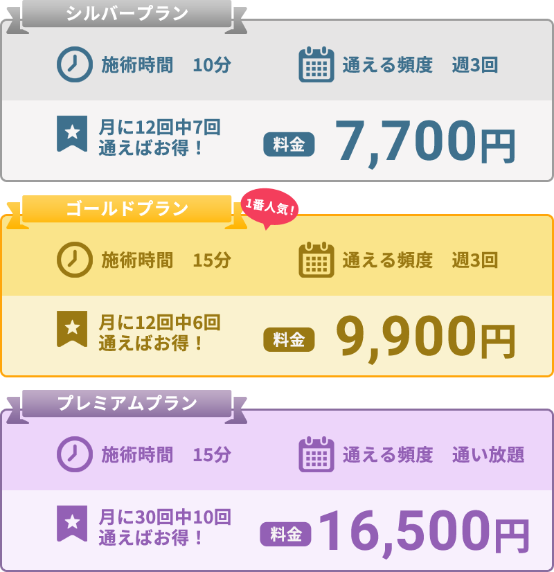 1回あたりの施術時間は15分と短時間ですが、こまめに通うことで、疲労を溜め込まず、身体を良い状態でキープすることを目的としています。